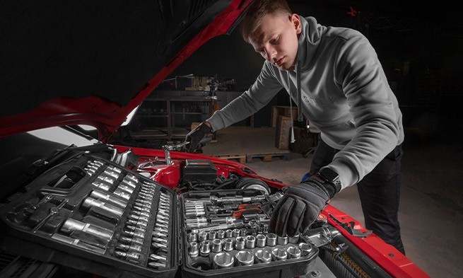 У комплекті 110 одиниць інструментів — від насадок біт до торцевих головок Е-типу. Він містить усе необхідне для якісного ремонту, виконання більшості робіт в автомайстерні, гаражі або СТО.